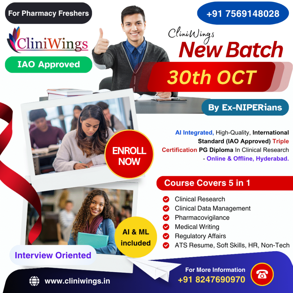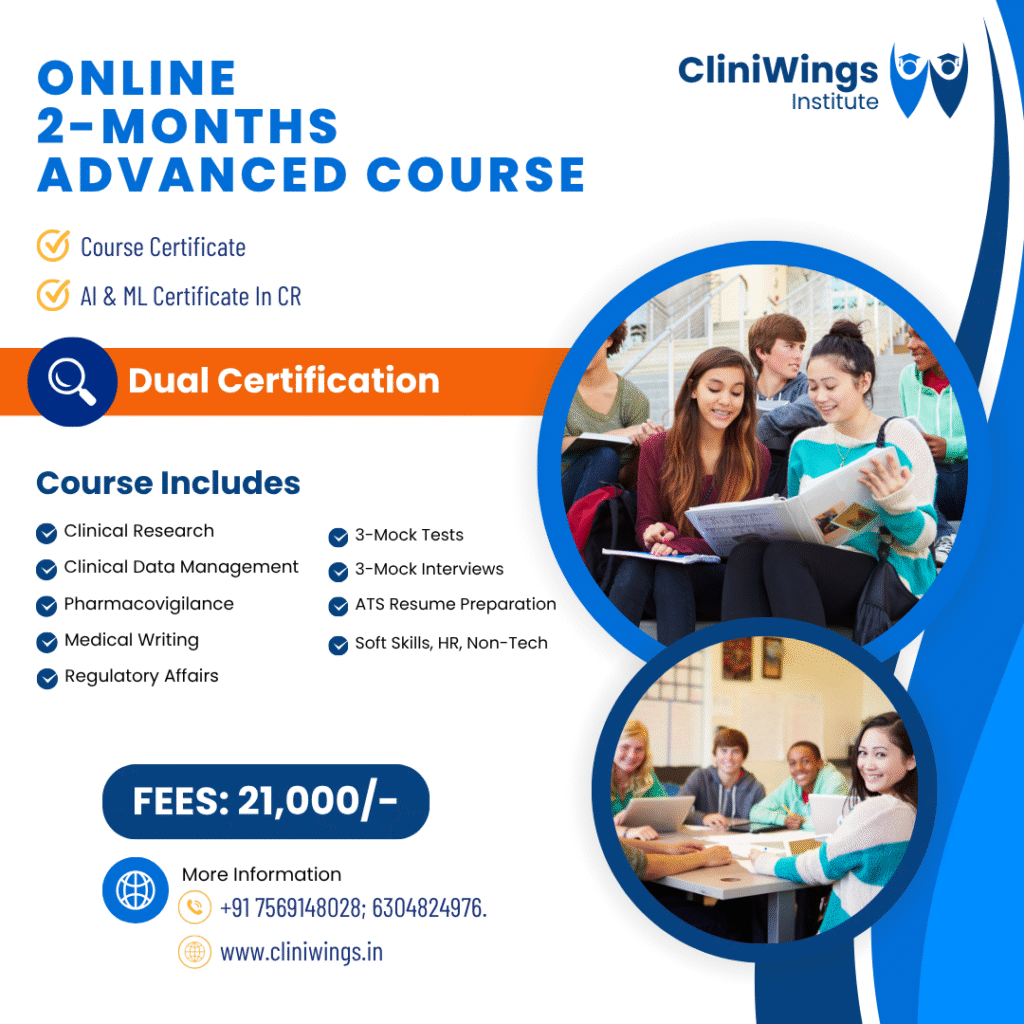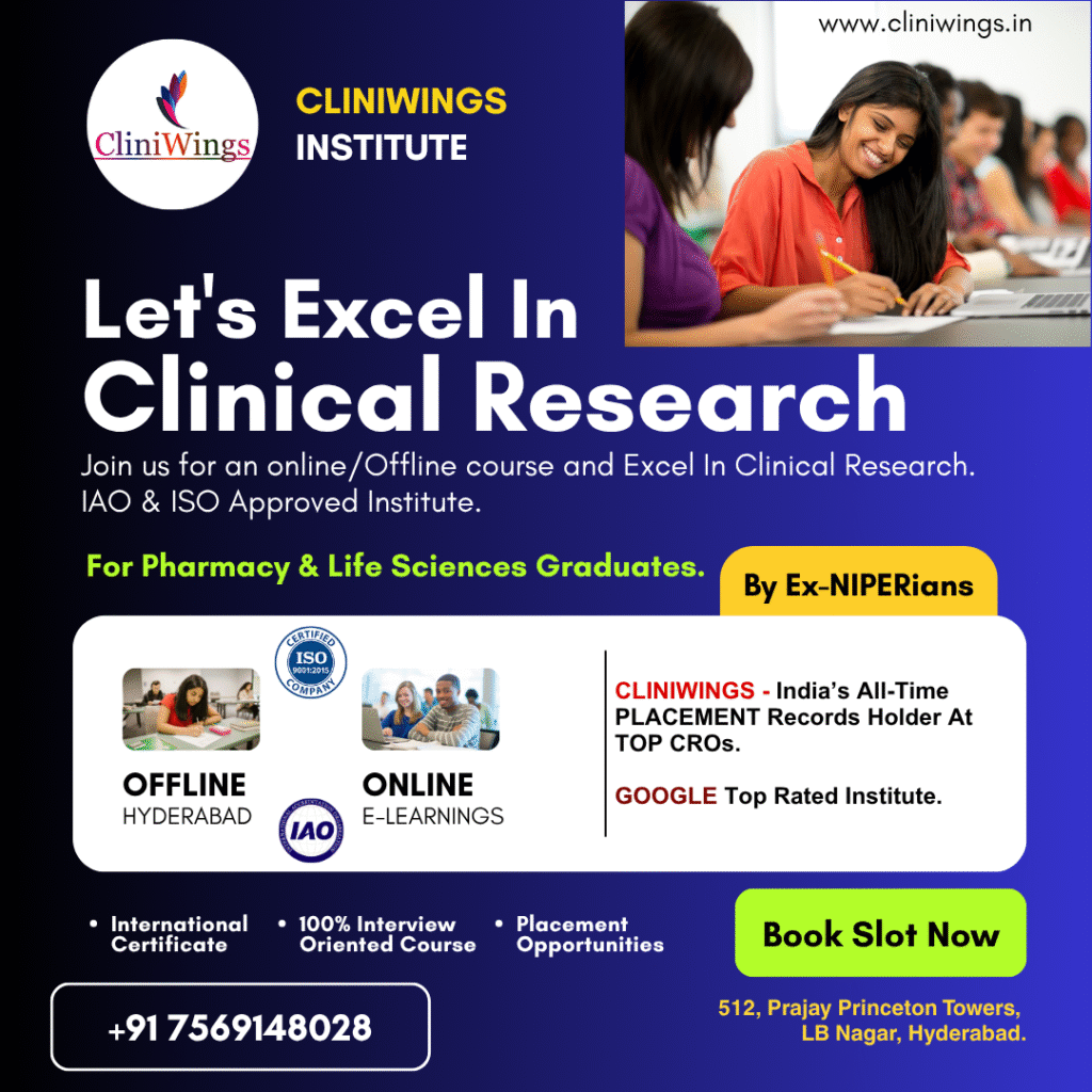 CliniWings is a leading Clinical Research Training & Placement Institute, dedicated to empowering Pharm D, M. Pharmacy, and B. Pharmacy graduates with industry-relevant skills. Our ISO 9001:2015 & MSME certified institute offers expert-led online certification courses in Clinical Research (CR), Clinical Data Management (CDM), Pharmacovigilance (PV), Medical Writing (MW), Regulatory Affairs (RA), and Health Economics & Outcomes Research (HEOR).