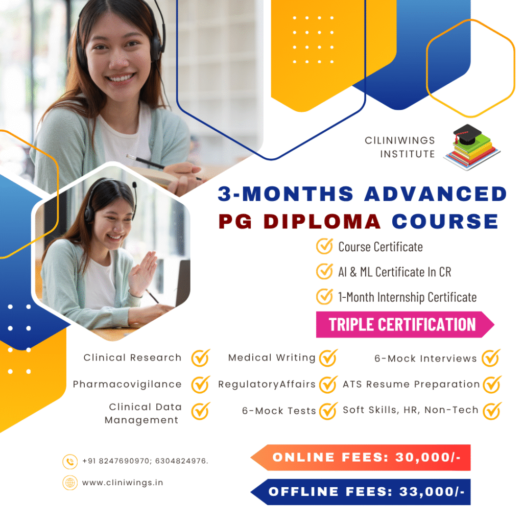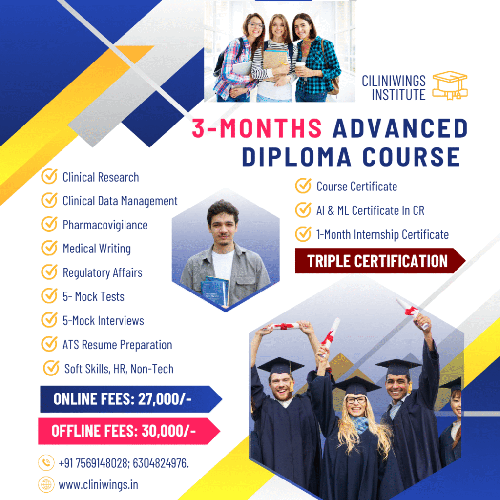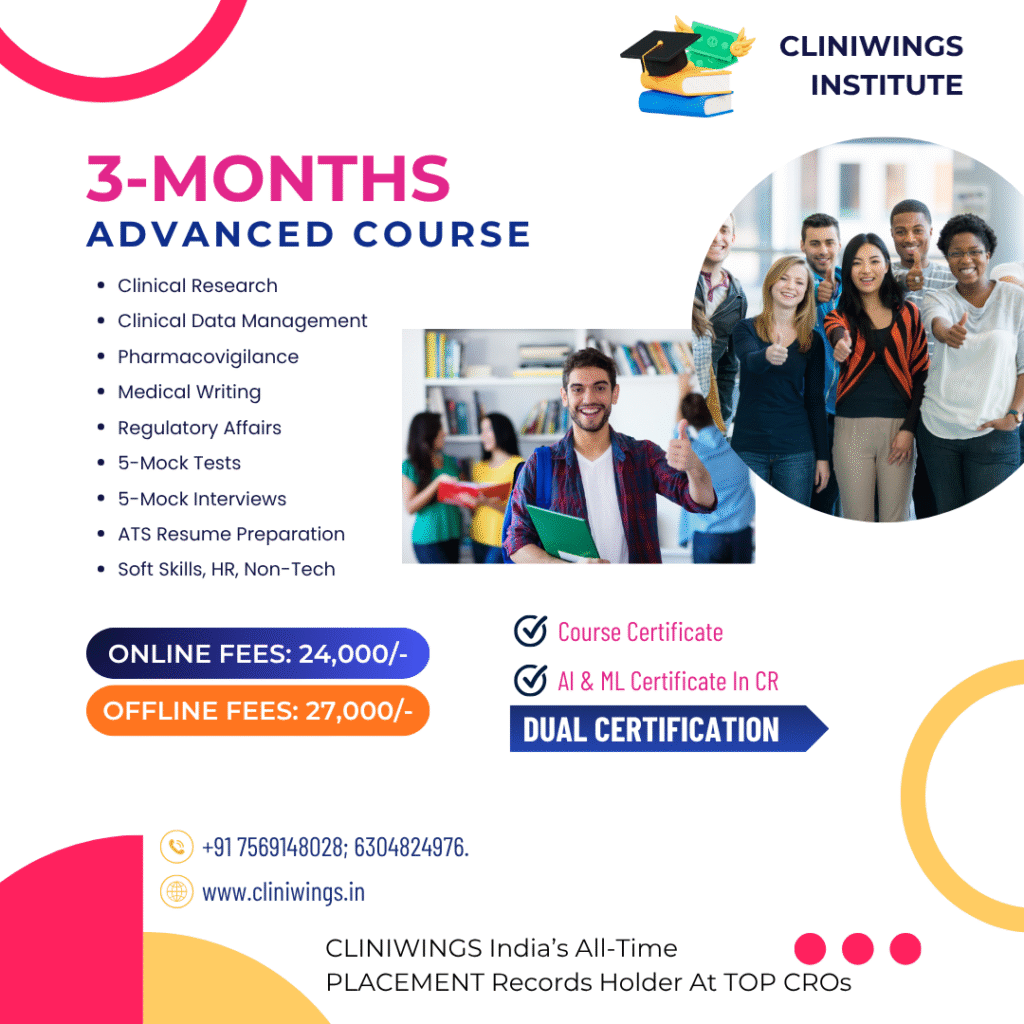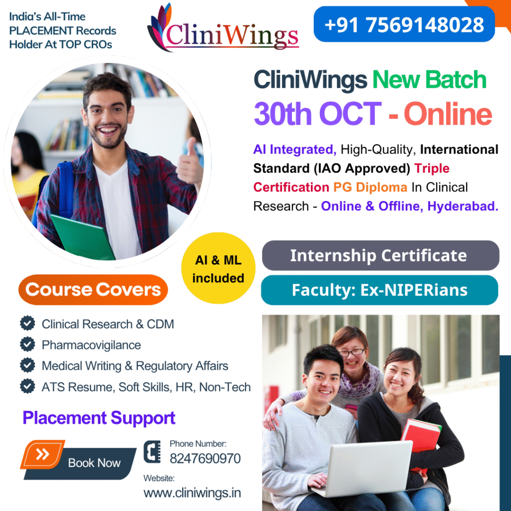 CliniWings is a leading Clinical Research Training & Placement Institute, dedicated to empowering Pharm D, M. Pharmacy, and B. Pharmacy graduates with industry-relevant skills. Our ISO 9001:2015 & MSME certified institute offers expert-led online certification courses in Clinical Research (CR), Clinical Data Management (CDM), Pharmacovigilance (PV), Medical Writing (MW), Regulatory Affairs (RA), and Health Economics & Outcomes Research (HEOR).